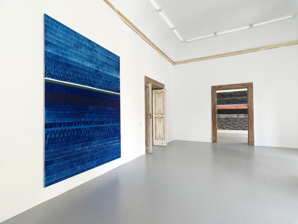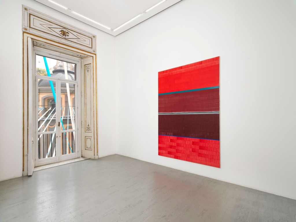 A su vez, en las históricas calles del decumano inferior de Nápoles, la consagrada galería Alfonso Artiaco acoge –una vez más– la obra del artista cántabro Juan Uslé (Santander, 1954). Las salas, embellecidas con detalles palaciales, techos altos con molduras doradas, ventanales y espacios prístinos, exponen desde el pasado 19 de mayo las 25 piezas recogidas en Ácrono: 13 pinturas y 12 dibujos. Todas ellas pertenecientes a la serie Soñé que revelabas (SQR) o cómplices del mismo eco. Los dibujos deben entenderse como bocetos del artista, una suerte de ejercicio de reflexión privada que en pocas ocasiones tenemos oportunidad de contemplar. Las pinturas rojas adquieren un protagonismo poco usual en esta línea de trabajo y agitan la consciencia de quienes lo ven.